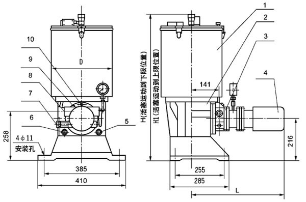 五、使用说明 1、应安装在环境温度合适,灰尘少,便于调整、检验、维修、拆洗及补脂方便的地方。 2、应尽可能布置在系统的中心位置,以缩短系统配管长度,保持最低压降,使泵能产生足以克服润滑点背压的压力。 3、首次使用前应先加入一定量的润滑油,让泵运转几分钟后再从补脂口以封闭方式用电动加油泵加入润滑脂。 4、电机减速机初用后三个月必须从排气塞孔处补充适量的3# 二硫化铝润滑剂,以后每隔四个月补充一次。 5、该泵为室内安装型,在室外或环境恶劣的场合使用时,必须采取防护措施。