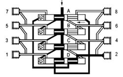 | 润滑剂以箭头方向进入分配器压送到活塞A的右侧末端。活塞A通过润滑剂压力而向左侧运动。位于活塞A左侧前端的润滑剂通过壳体内部通道输送到排出口2 并从此通过润滑位置管道到达摩擦位置。 |