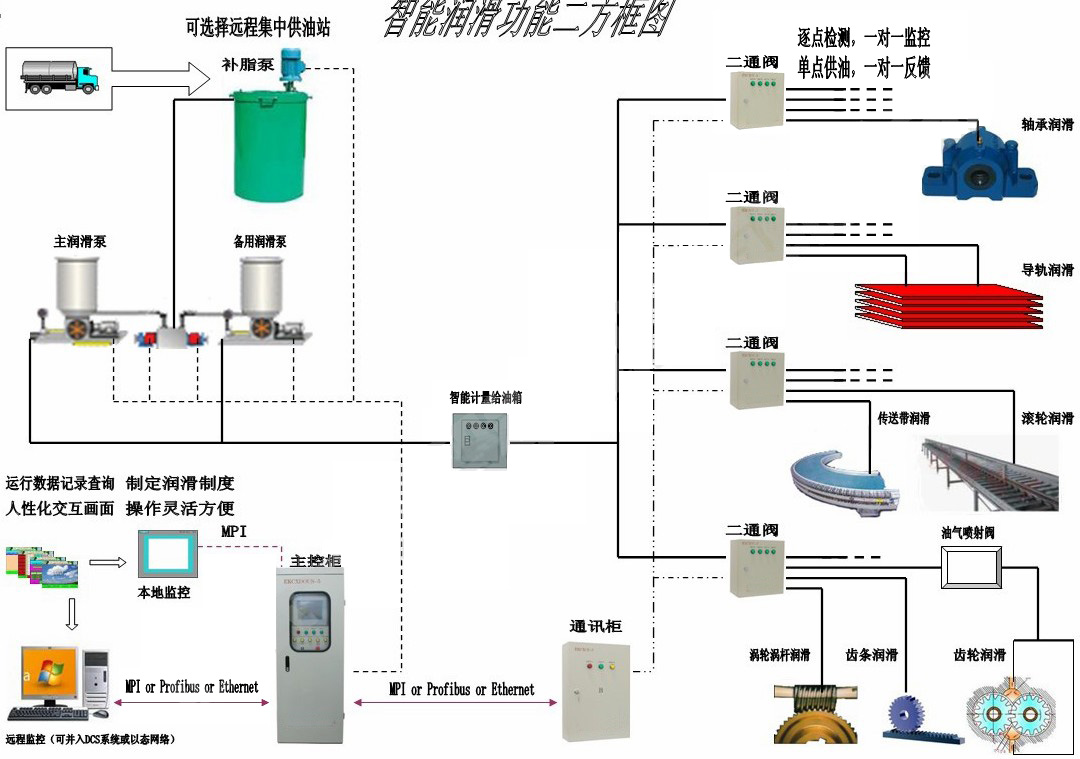 传统的机械设备润滑方式都采用单线或双线补脂润滑,它既不能实现每个润滑点定时定量补脂,又不能采集和贮存实时的每一个润滑点个性化数据,更不能实现一对一个性化监控,并且系统管路复杂,维护性差,故障点多等缺点,不便于现代化机械设备润滑的集中管理。