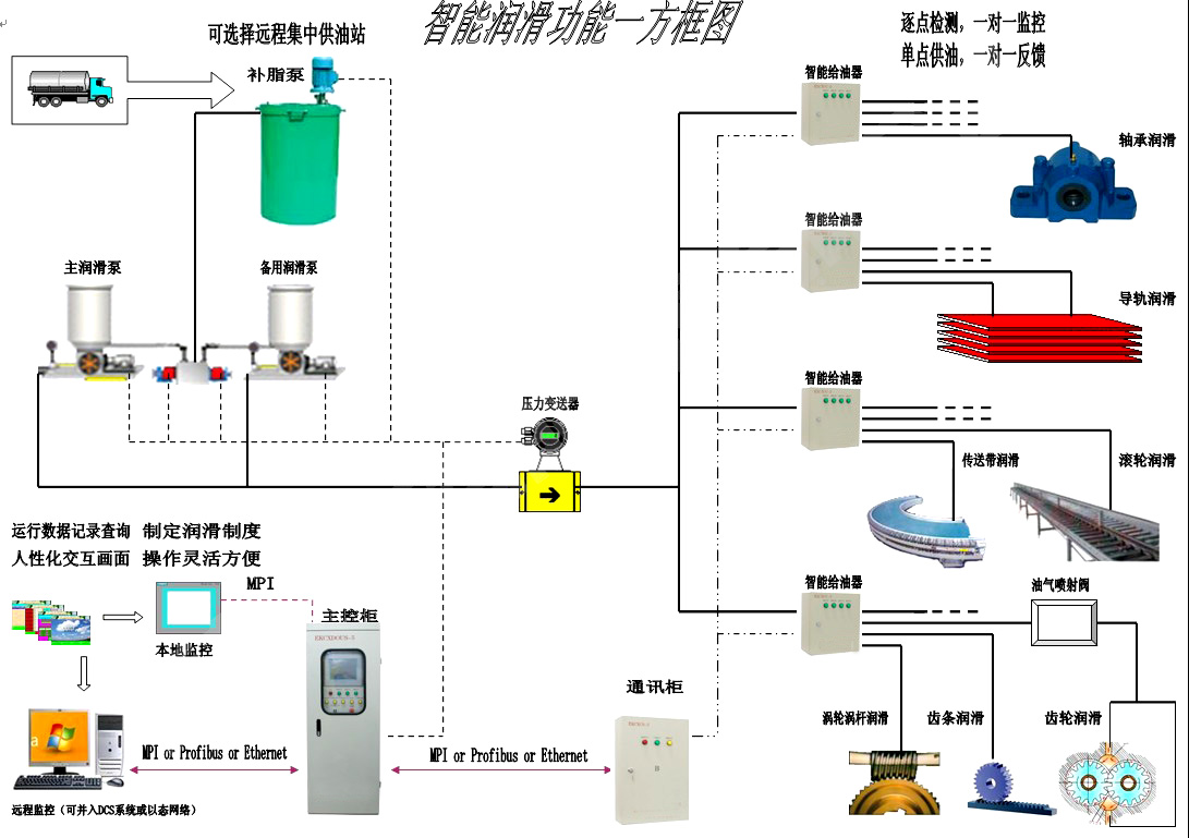 ①: CXILS-OL系统采用智能计量电磁给油器作为电磁给油器,利用油脂不可压缩特点的容积式供油,而不采用控制电磁给油器开启时间长短控制润滑点补油量,故CXILS-OL系统的供油精度达到99.5%,极大地提高系统性能。 ②: 因采用智能计量电磁给油器供油,所以它有以下特点是:对系统压力、管道长度、出油口口径、供油时间、润滑点是否微量漏油和油口出现微堵等各种工况均不影响补脂量的精度。 ③:智能计量电磁给油器是把电磁给油器和流量传感器巧妙地合二为一,减少了控制环节,增加了系统工作稳定性。 ④: 智能计量电磁给油器具有多种功能,既具有油路通断功能,又具有反馈补脂量的特性;既具自身故障的反馈,又具有末端润滑点出油口工况的反馈。 ⑤: CXILS-OL系统不但可在微机和触摸屏控制各润滑点补脂,还可以在未端分控柜上控制对应润滑点补脂,同时能现场反馈实时故障点位置,这样大大地减少了安装调试和日常检修的工作量。 |